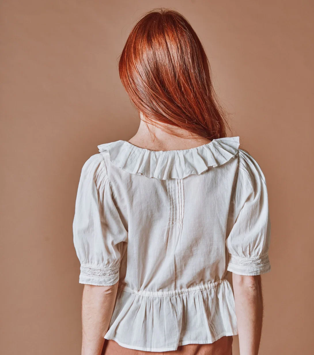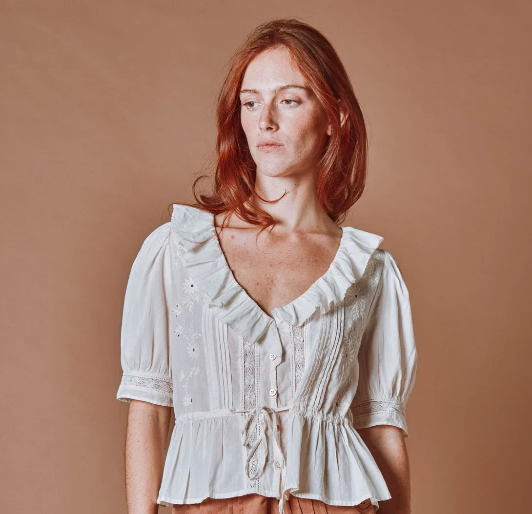 Blusa vintage de voile de algodón orgánico color crema con escote fruncido.