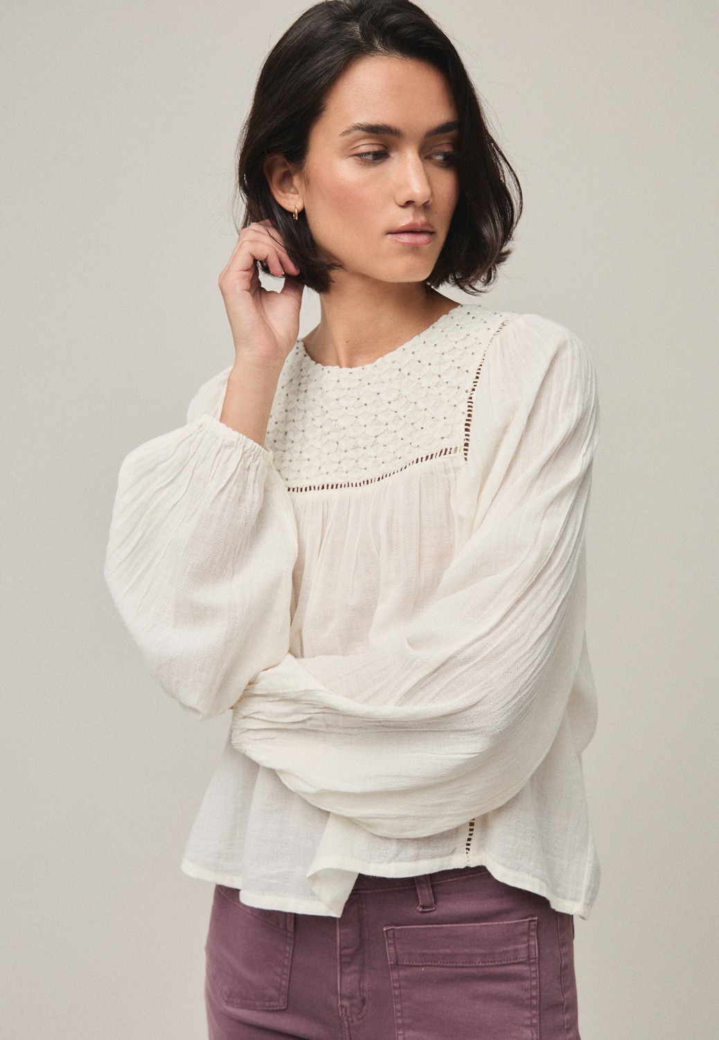 Blusa vaporosa. Cuello redondo con detalle de abertura con botón en espalda. Bordado a mano con abalorios en la parte superior frontal. Manga murciélago con puño engomado.