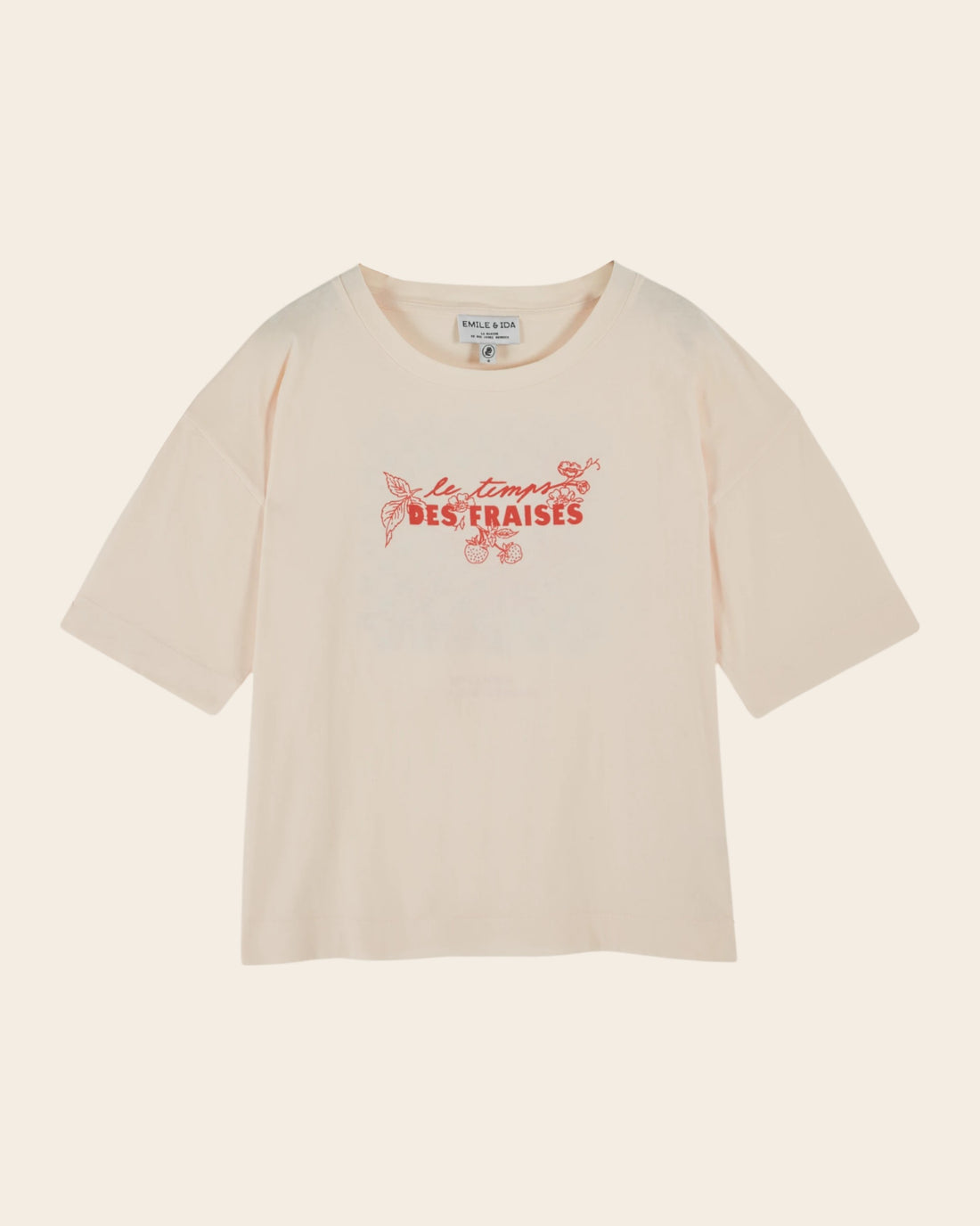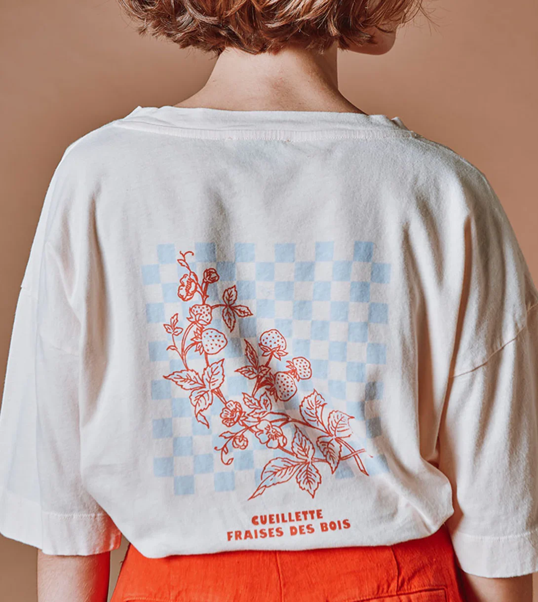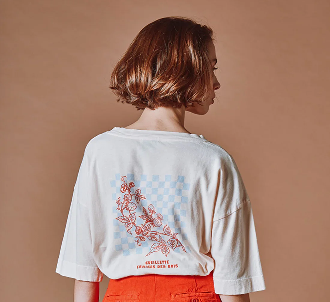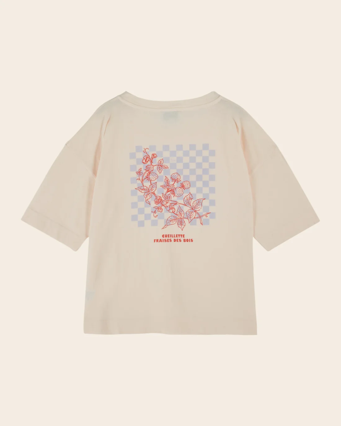 Camiseta de manga corta en jersey de algodón orgánico color crema con estampado «Le temps des fraises» en la parte delantera y una ilustración de una recogida de fresas sobre un fondo de cuadros azul grisáceo en la espalda.