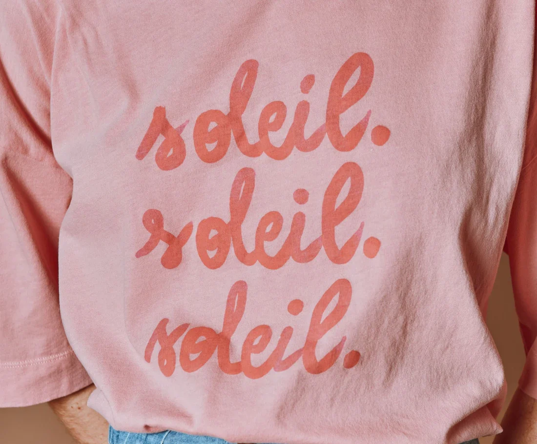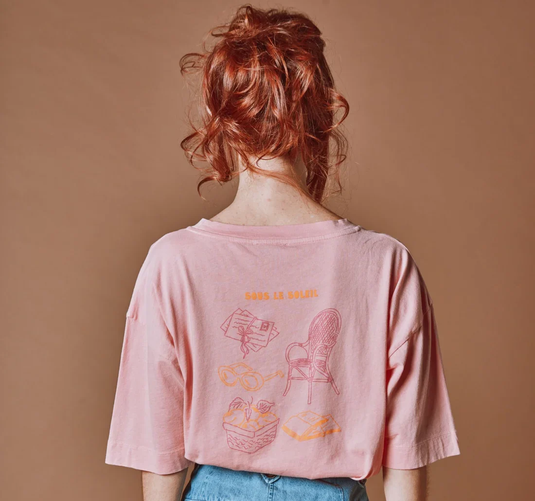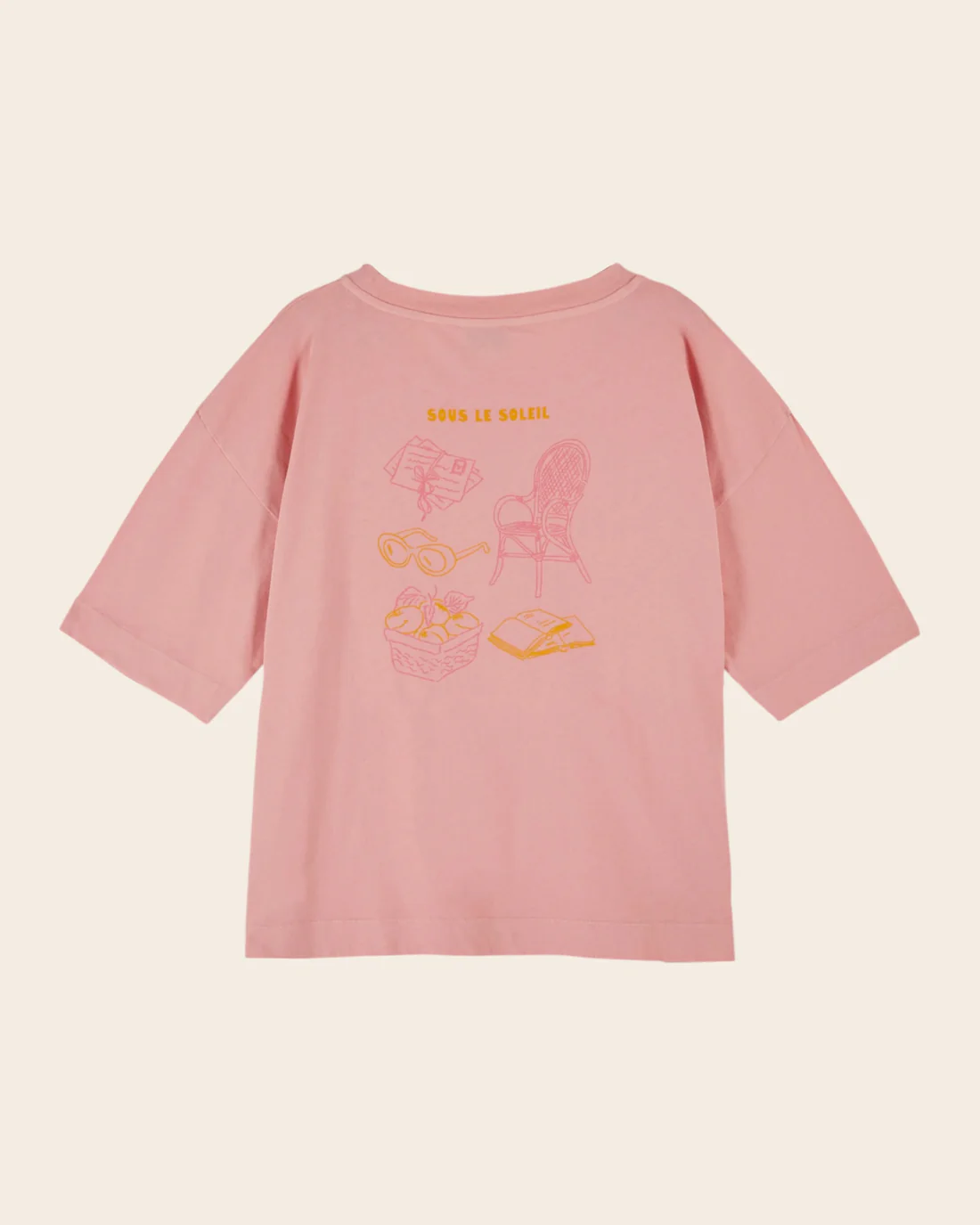 Camiseta de manga corta en jersey de algodón orgánico rosa indio con estampado «Soleil. Soleil. Soleil» en la parte delantera e ilustraciones en la espalda que inspiran vacaciones «bajo el sol».