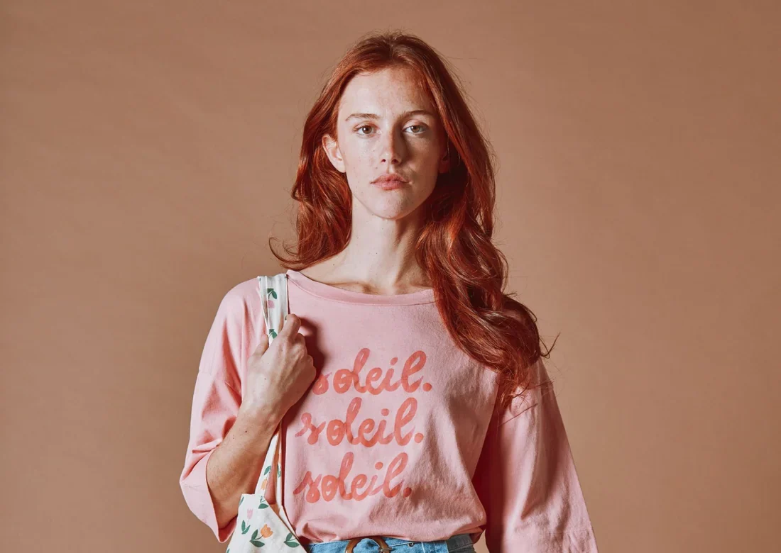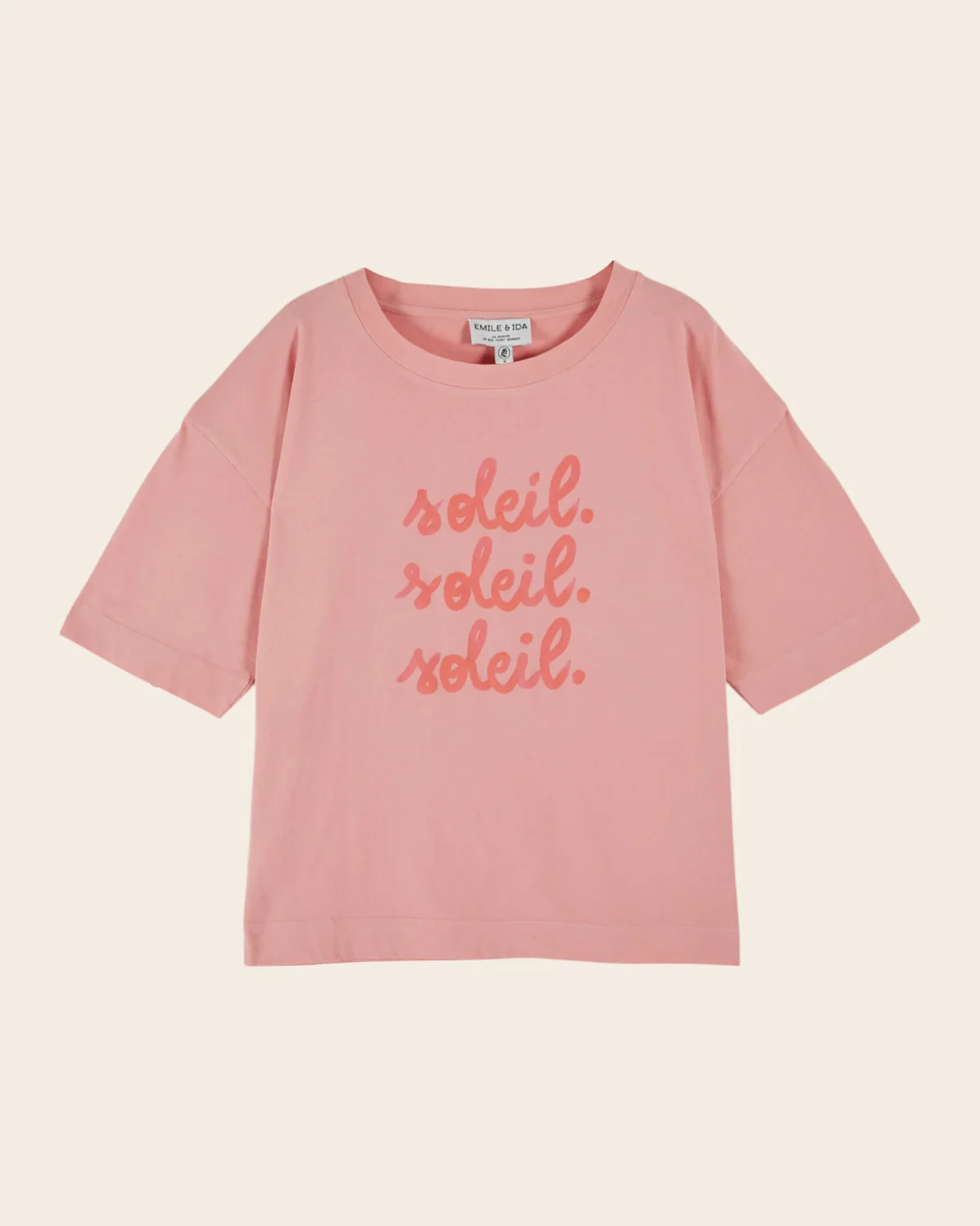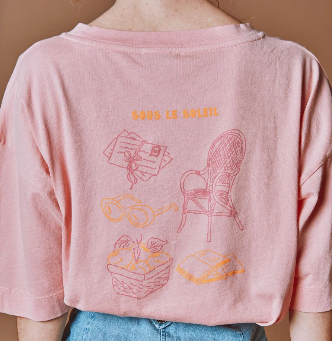 Camiseta de manga corta en jersey de algodón orgánico rosa indio con estampado «Soleil. Soleil. Soleil» en la parte delantera e ilustraciones en la espalda que inspiran vacaciones «bajo el sol».