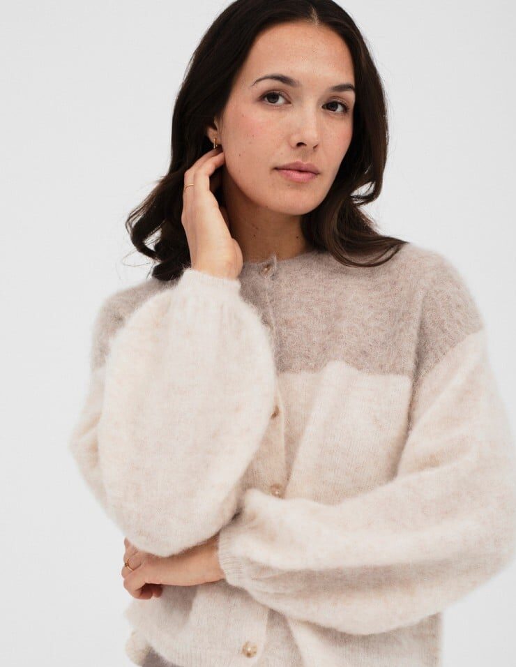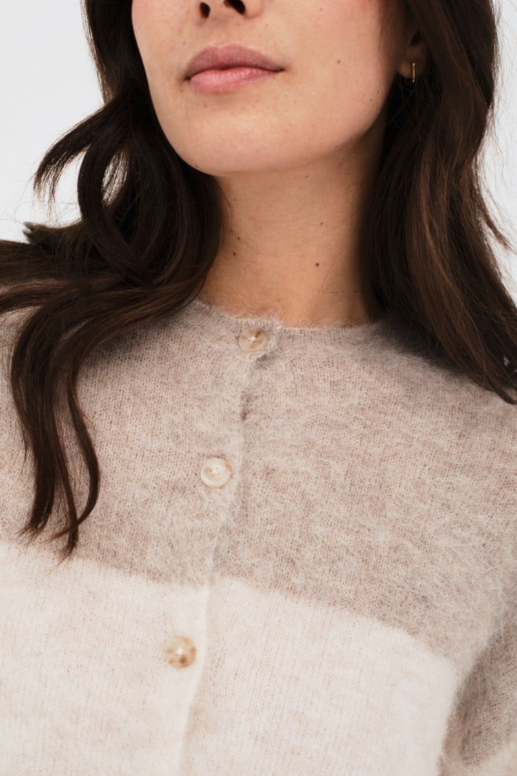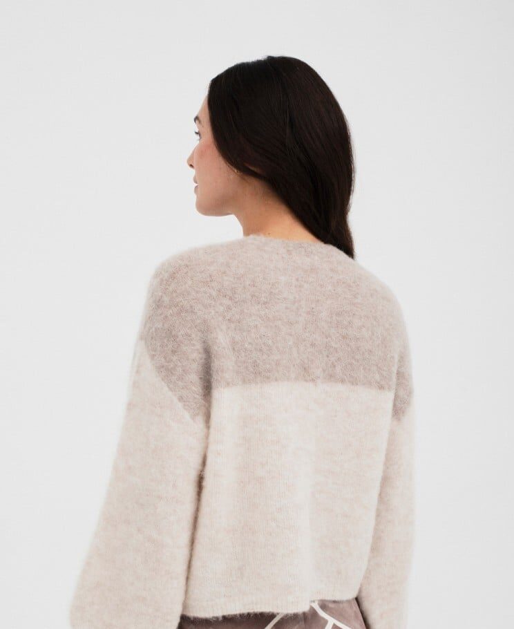 Cárdigan corto confeccionado en intarsia bicolor con botonadura, creando una pieza elegante y casual.