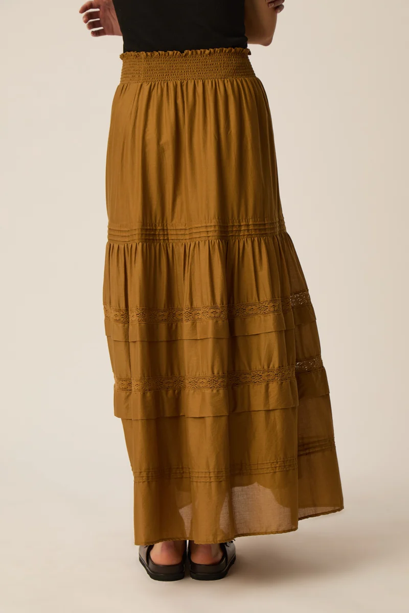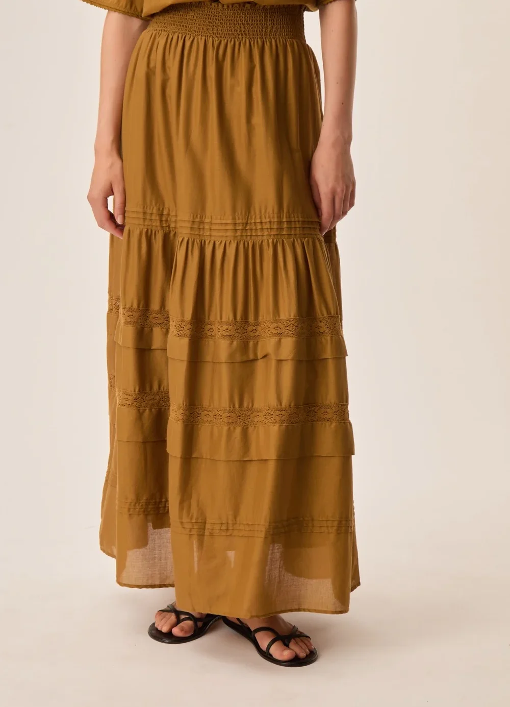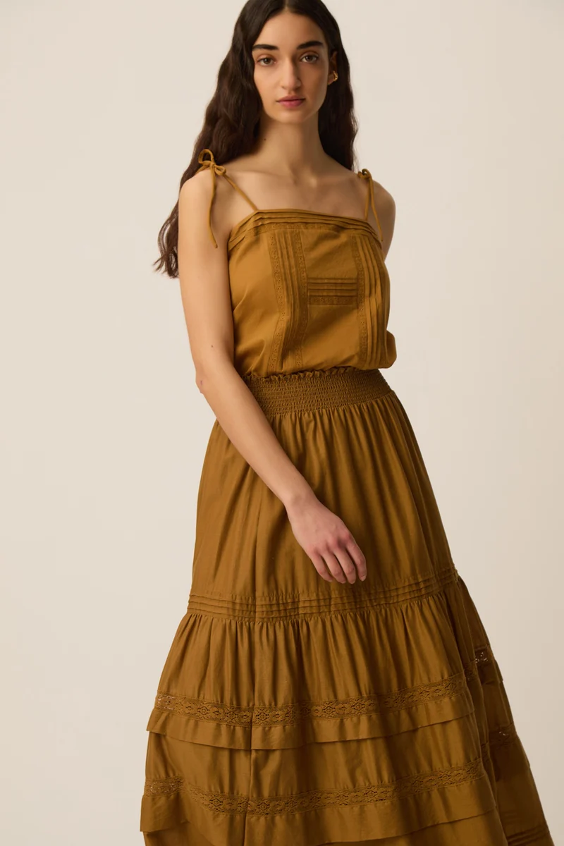 Costuras horizontales, frunces, pliegues y encaje a lo largo de toda la falda