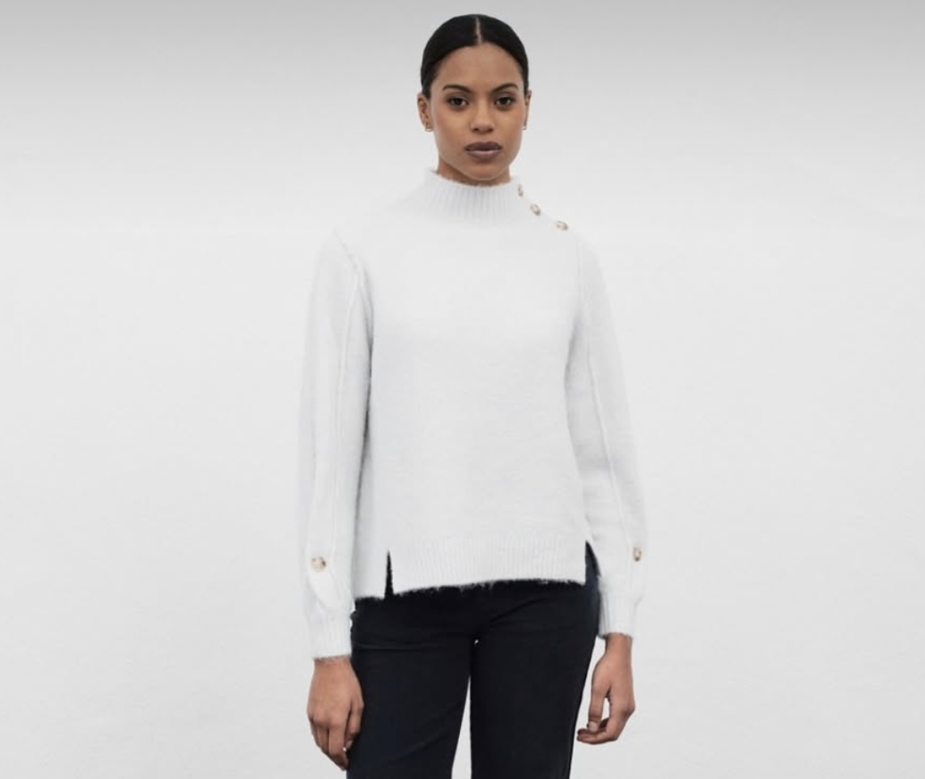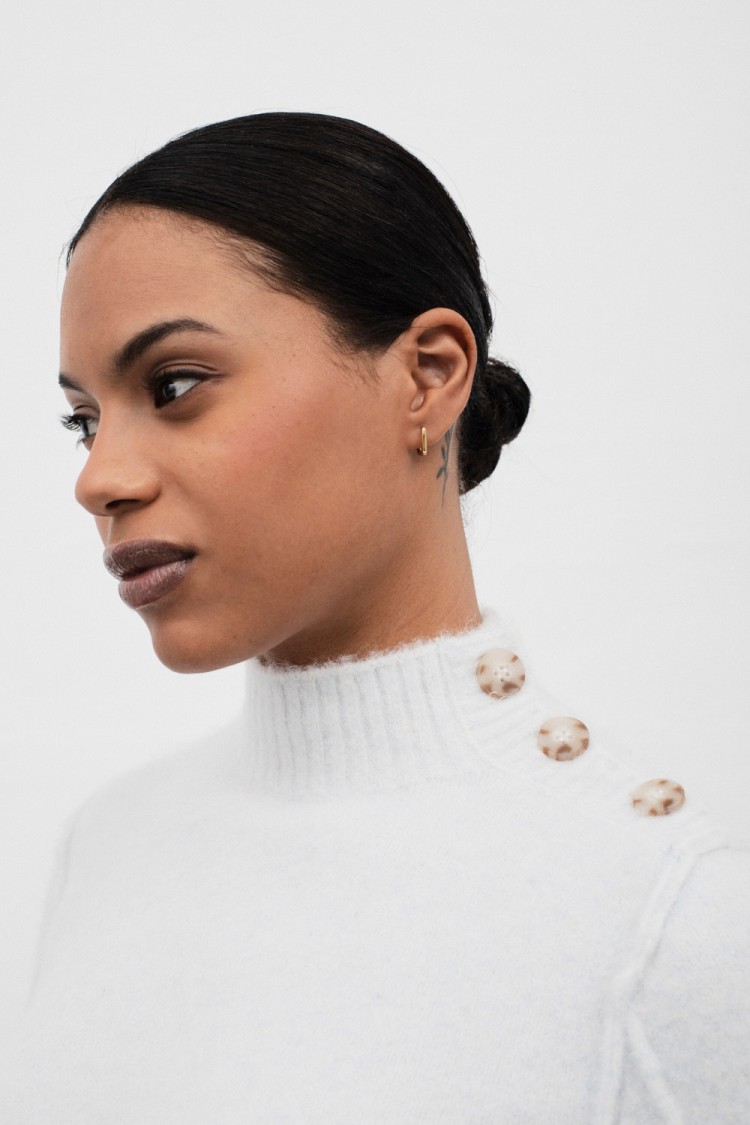 Jersey de manga larga y cuello alto con detalle de botonadura lateral en cuello y hombro.