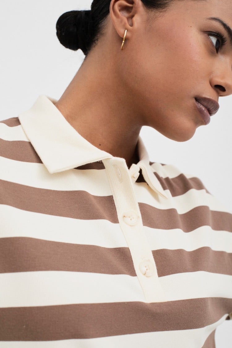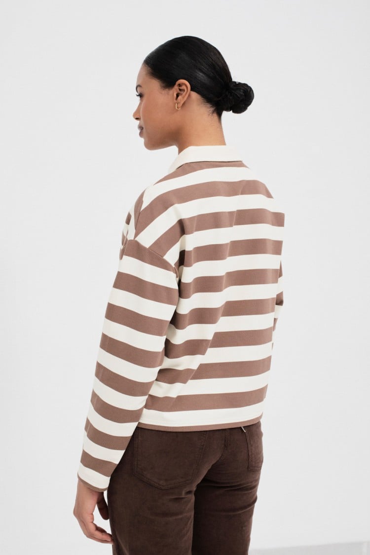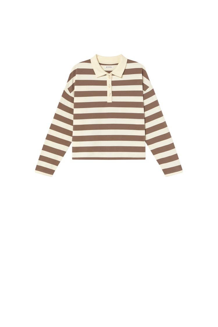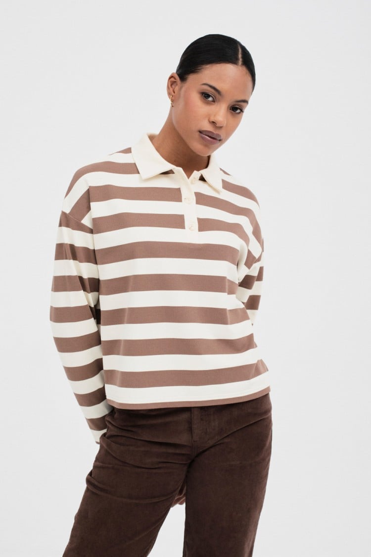 Polo de rayas anchas y manga larga. Con cuello y tapeta de canalé tipo polo en el mismo tono.