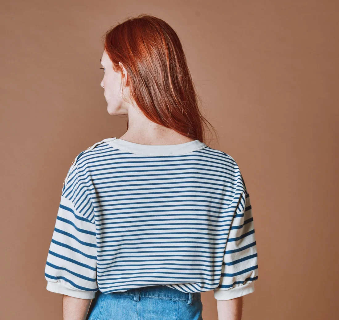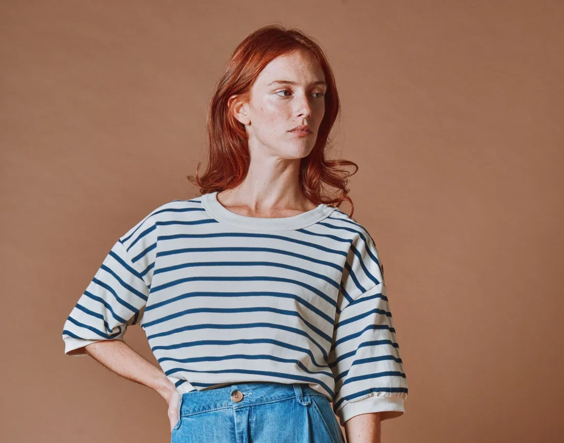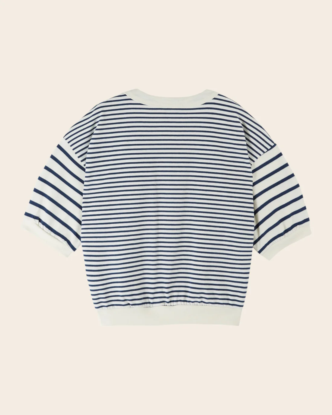Sudadera de manga corta en felpa de algodón orgánico con rayas azul marino y crudo.