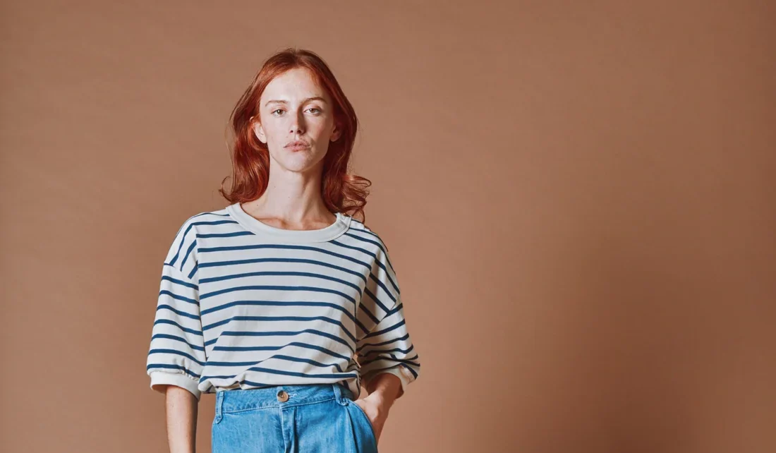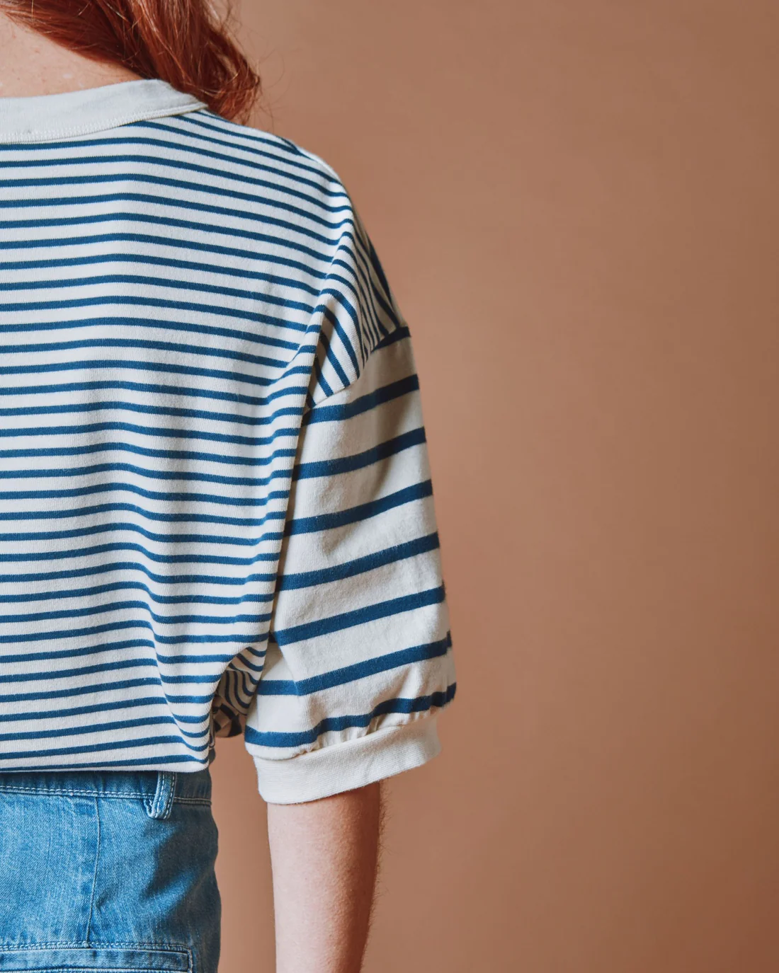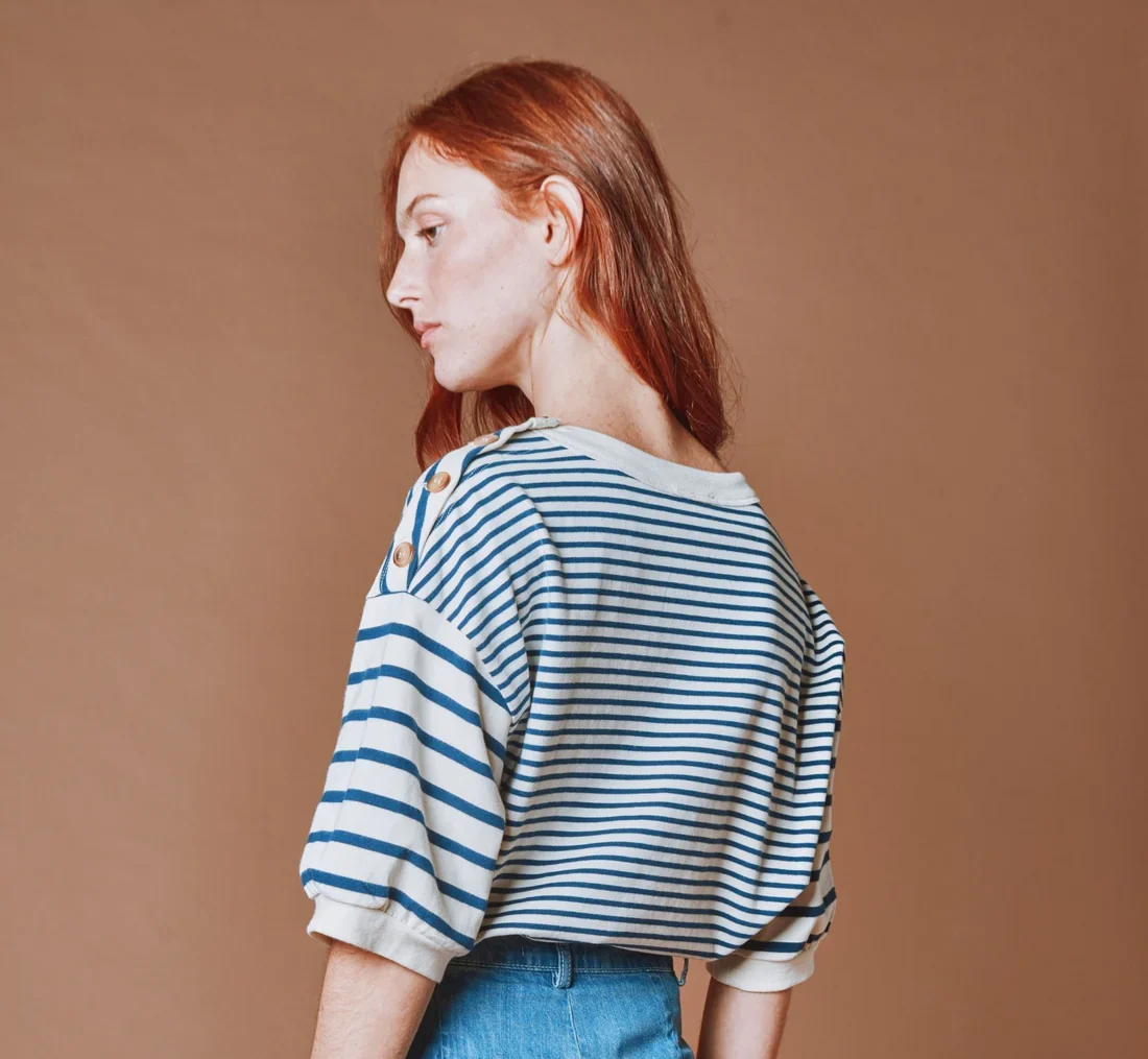 Sudadera de manga corta en felpa de algodón orgánico con rayas azul marino y crudo.