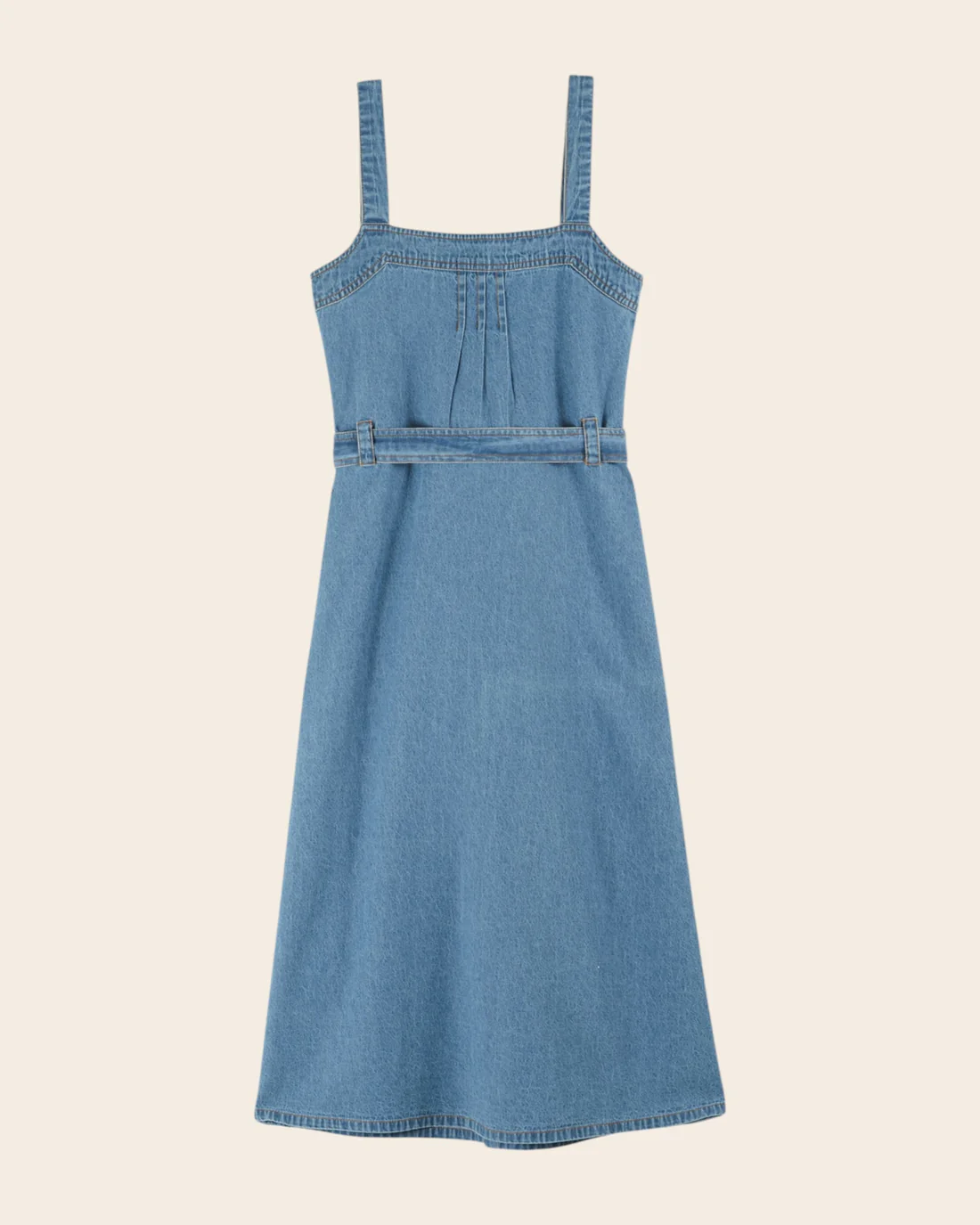 Vestido vaquero de algodón azul claro con tirantes. Las pinzas en el pecho y la cintura se adaptan a las curvas.